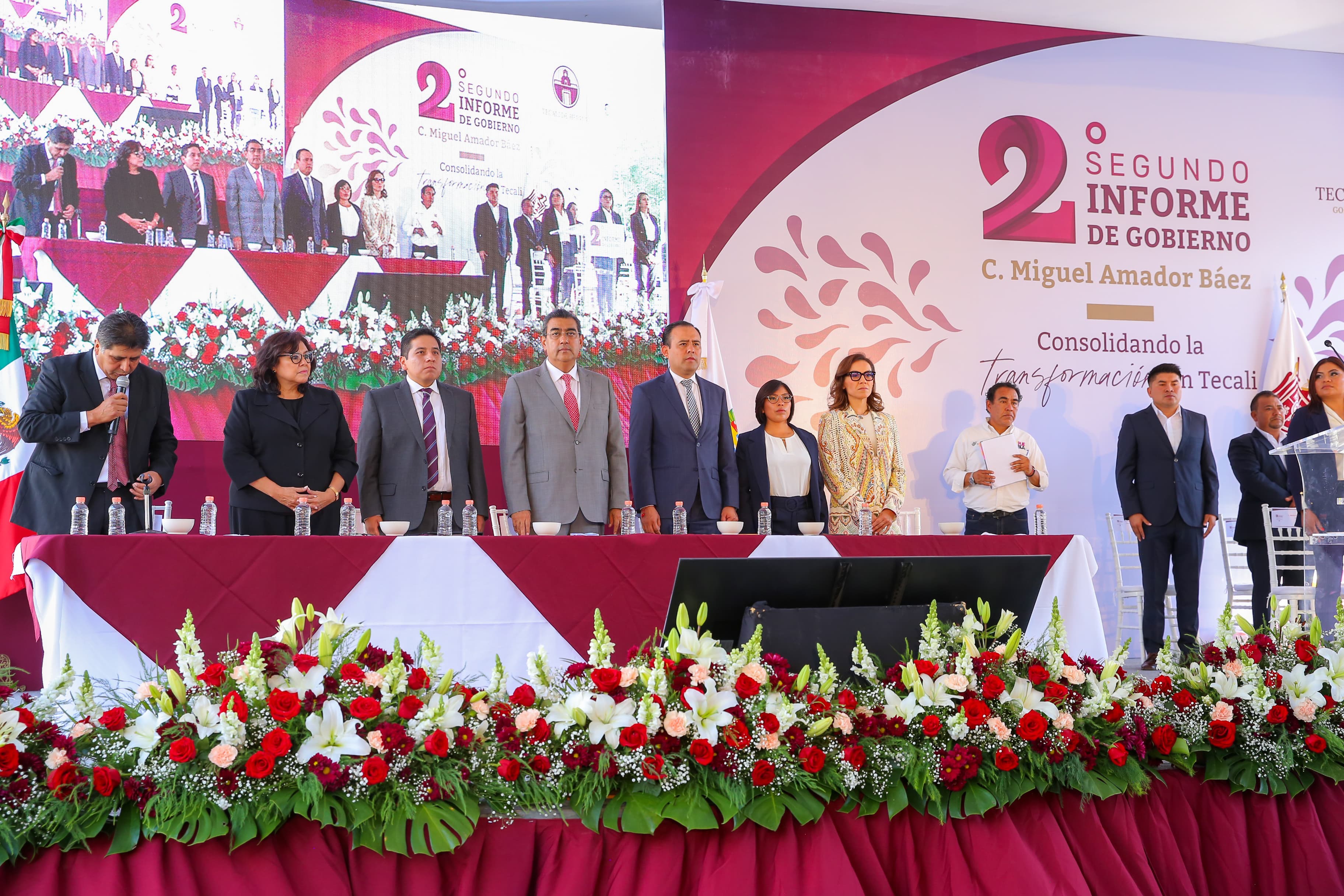 TECALI DE HERRERA, Pue.- El gobierno de Puebla sigue con firmeza la visión del presidente de México, Andrés Manuel López Obrador, de luchar contra la desigualdad y garantizar el bienestar de todas y todos, manifestó el gobernador Sergio Salomón al asistir al segundo informe de gobierno de Miguel Ángel Amador Báez, edil de Tecali de Herrera.