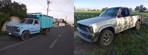 Los policías se percataron que en los ejidos de esta junta auxiliar se encontraban abandonadas dos camionetas, una Pick Up marca Mazda color gris modelo 1987 con placas del estado de Morelos y una Ford tipo 350 modelo 1982 color azul cielo con placas de circulación del estado de Tlaxcala.