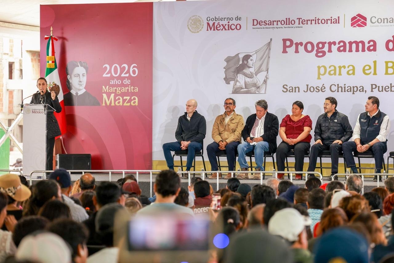 San José Chiapa, Pue.- La presidenta de Mexico, Claudia Sheinbaum Pardo visitó el municipio de San José Chiapa para hacer la entrega de créditos liquidados del Programa de Vivienda para el Bienestar, en donde afirmó que el acceso a una vivienda digna es un derecho y no un privilegio, por lo que el programa beneficia a cinco millones de familias que antes enfrentaban tarifas impagables, con créditos justos y sin intereses para quienes perciben menos de dos salarios mínimos.