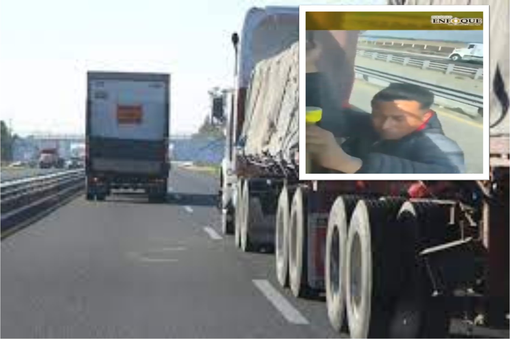 Amozoc, Pue.- A través de redes sociales se dio a conocer un video, donde el conductor de un tráiler que circulaba sobre la autopista Puebla-Orizaba, a la altura de Amozoc pide ayuda, ya que un sujeto se colgó al tráiler para asaltarlo con otros que lo seguían en una camioneta.