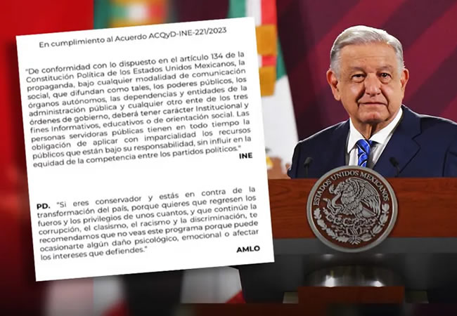 Ciudad de México.- El presidente Andrés Manuel López Obrador acató la medida cautelar impuesta por el Instituto Nacional Electoral (INE) y antes de iniciar su conferencia de este lunes se proyectó un mensaje en el que se indican los límites marcados por el artículo 134 constitucional sobre los principios de imparcialidad y neutralidad.