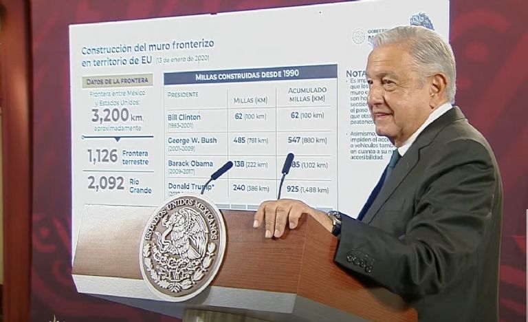 "Cada presidente tiene que hacer su parte de muro", fue la frase con la que el presidente Andrés Manuel López Obrador comparó la realización del reforzamiento en la frontera entre México y Estados Unidos y las campañas electorales en el país norteamericano. Durante la conferencia matutina de este viernes, el mandatario aseguró que en total se han construido mil 488 kilómetros en total, mientras que, en total, la línea que divide las dos naciones es de al menos tres mil 200 kilómetros.