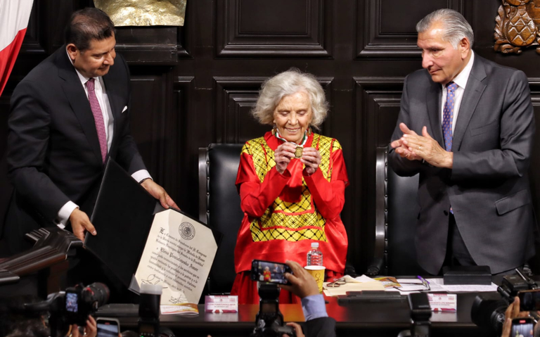 El Senado avaló por unanimidad que Elena Poniatowska recibiera la medalla al considerarla que es una “mujer de su tiempo y libre pensadora que expresa, en sus letras y en sus opiniones, sus firmes convicciones por un México cada vez más libre, justo, igualitario y democrático”.