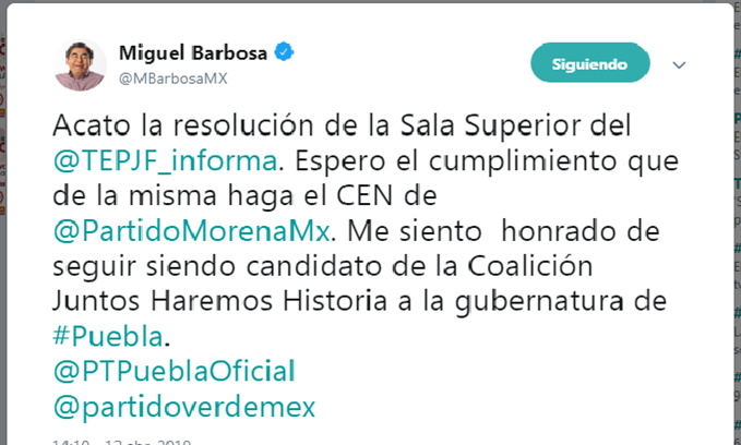 «Acato la resolución de la Sala Superior del @TEPJF_informa. Espero el cumplimiento que de la misma haga el CEN de @PartidoMorenaMx. Me siento honrado de seguir siendo candidato de la Coalición Juntos Haremos Historia a la gubernatura de #Puebla. @PTPueblaOficial @partidoverdemex», posteó Barbosa Huerta en sus redes sociales.