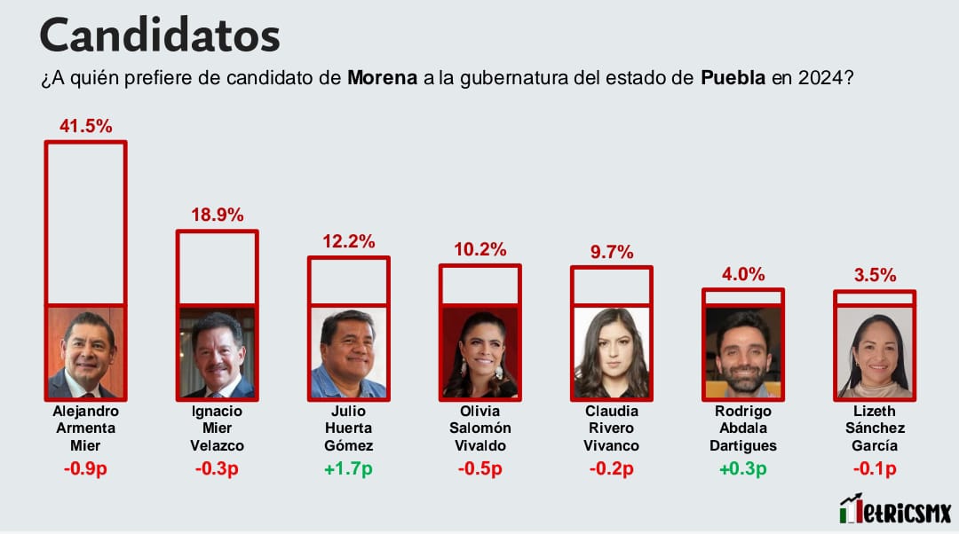 Con Armenta como favorito y con una ventaja de al menos 22 puntos, la empresa Metricsmx lo coloca en el primer lugar del top de las preferencias, al aparecer en el tracking diario de aspirantes morenistas a la gubernatura de Puebla, como el mejor perfil para representar al partido en la próxima contienda de elección a celebrarse en el 2024.