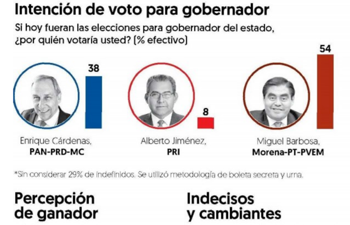 Puebla, Pue. A siete días de las elecciones extraordinarias del 2 de junio para elección de gobernador en la entidad, el candidato de la coalición Juntos haremos historia en Puebla, Miguel Barbosa Huerta tiene una intención de voto de 54 por ciento, lo cual lo coloca 16 puntos arriba de su competidor más cercano Enrique Cárdenas, aspirante de la alianza conformada por PAN, PRD y Movimiento Ciudadano.