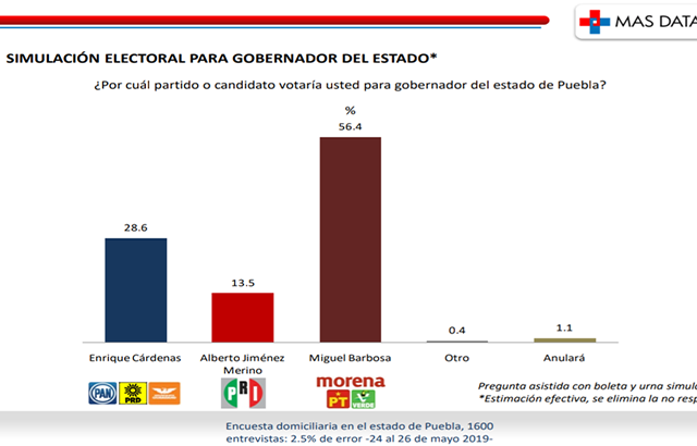 Puebla, Pue. De acuerdo a la reciente encuesta de la empresa MAS DATA, Miguel Barbosa Huerta, candidato de la coalición Juntos haremos historia en Puebla, se perfila como el ganador de las elecciones extraordinarias del 2 de junio, con el 56.4 por ciento de los entrevistados, 28 puntos arriba de Enrique Cárdenas Sánchez.