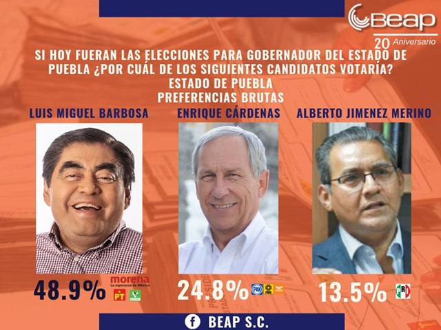 Puebla, Pue. En una nueva encuesta, que se realizó del 24 al 28 de mayo por parte del grupo BEAP, el candidato de la coalición Juntos haremos historia en Puebla, Miguel Barbosa Huerta, ganaría las elecciones del 2 de junio con el 48.9 por ciento, sobre Enrique Cárdenas del PAN, PRD y MC, con 24.8 por ciento.