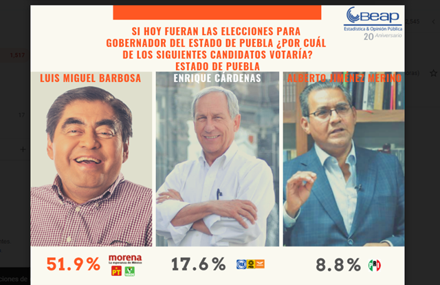 Con respecto a los candidatos, el 51.9 por ciento de los entrevistados votaría por Miguel Barbosa Huerta (Morena-PT-PVEM), el 17.6 por ciento por Enrique Cárdenas (PAN-PRD-MC) y el 8.8 por ciento por Alberto Jiménez Merino (PRI).