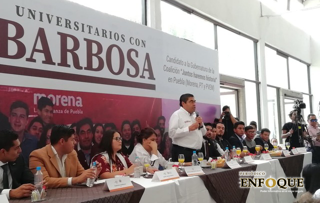 Puebla, Pue. Luis Miguel Barbosa Huerta, candidato de la coalición “Juntos Haremos Historia en Puebla” (MORENA-PT-PVEM), prometió que en caso de llegar al poder ejecutivo estatal, los estudiantes de institutos y universidades incorporadas a la SEP y BUAP tendrán las mismas condiciones laborales para acceder al 20 por ciento de su gabinete, el cual estará encabezado por jóvenes entre 20 a 29 años de edad.