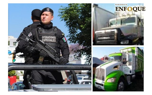 Finalmente, los cinco tractocamiones asegurados fueron: marca Volvo, tipo Torton; marca International, tipo Torton; marca Kenworth, acoplado a una caja seca; marca Kenworth, tipo Rabón y un marca Kenworth, tipo Torton.