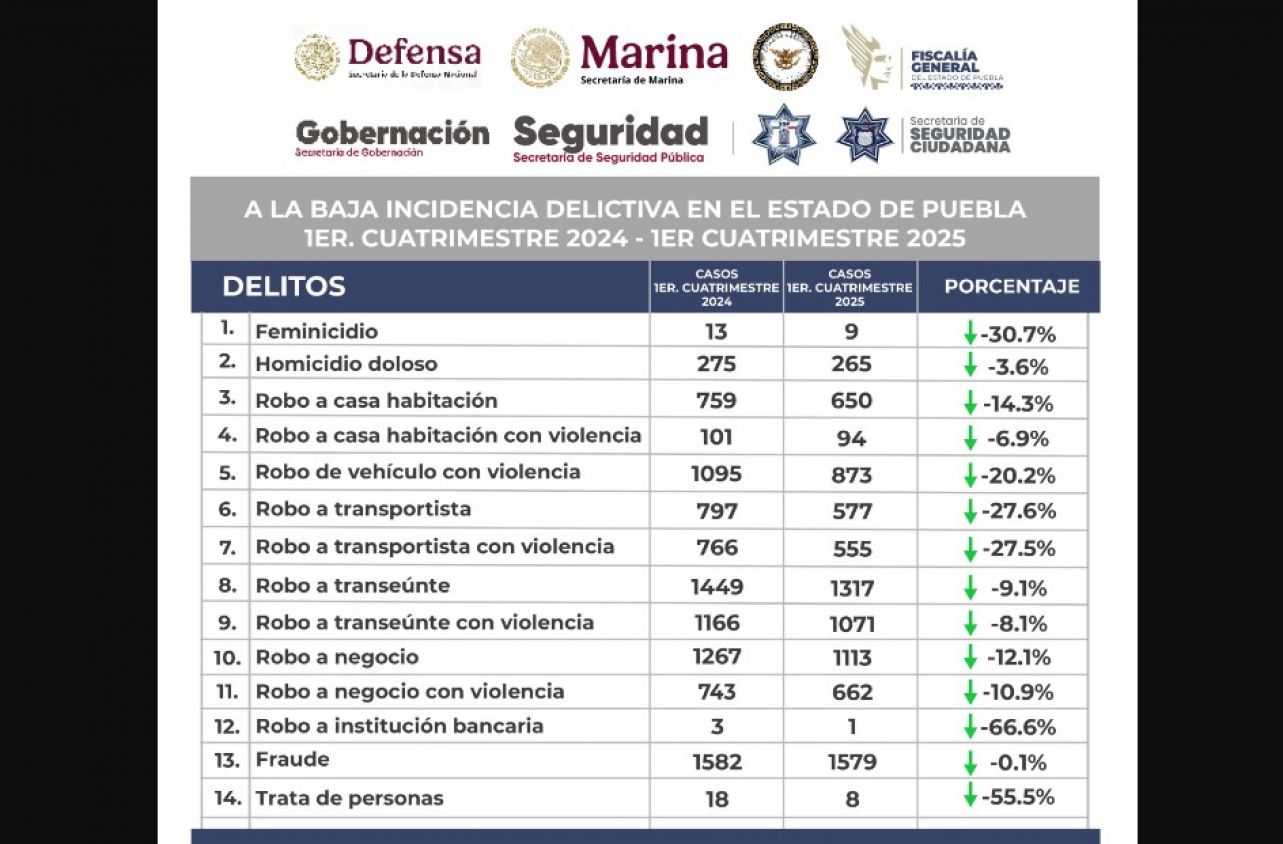Estos resultados consolidan a Puebla como un estado que prioriza la seguridad pública mediante estrategias integrales, evaluación constante y trabajo conjunto.