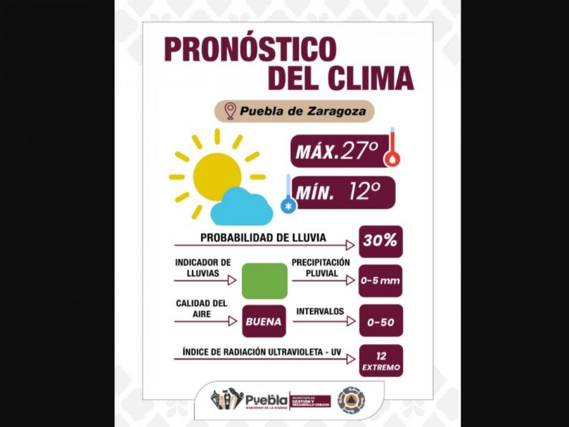 Este miércoles 23 de julio de 2025, se pronostica un día mayormente soleado en la capital poblana, con ligera nubosidad por la tarde y baja probabilidad de lluvias. Se estiman acumulaciones entre 0 y 5 mm.