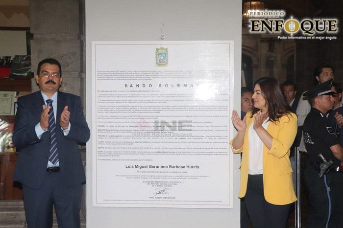 Puebla, Pue.- El Instituto Nacional Electoral (INE) y el Instituto Electoral del Estado realizaron la colocación de bandos en los inmuebles de los diferentes poderes del estado para dar a conocer que el próximo 1 de Agosto tomará protesta Luis Miguel Barbosa Huerta como gobernador constitucional de Puebla.