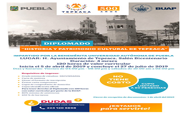Redacción. Tepeaca, Pue. A través de las cuentas oficiales de redes sociales, el H. Ayuntamiento de Tepeaca, dio a conocer el diplomado “Historia y Patrimonio Cultural de Tepeaca”, el cual pretende captar a un grupo de 50 personas, quienes a través de la Benemérita Universidad Autónoma de Puebla –BUAP- tomarán módulos con contenidos relativos a la Fundación de la Villa Segura de la Frontera.