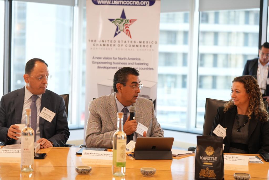 NUEVA YORK, EE.UU.- Para promover a Puebla como destino de las inversiones y que más compañías se establezcan en la entidad, así como fortalecer lazos con empresarios, el gobernador Sergio Salomón sostuvo un encuentro con miembros de la Cámara de Comercio México-Estados Unidos, capítulo Noreste.