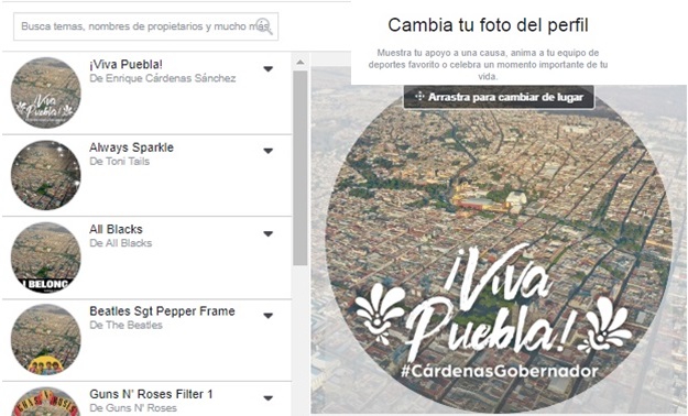 Al darle click a la liga, esta redirecciona al usuario a su Facebook para que autorice que en su foto de perfil sea colocada una marca de agua con la leyenda “¡Viva Puebla! #CárdenasGobernador”, de esta forma el candidato suma a su campaña a los poblanos.