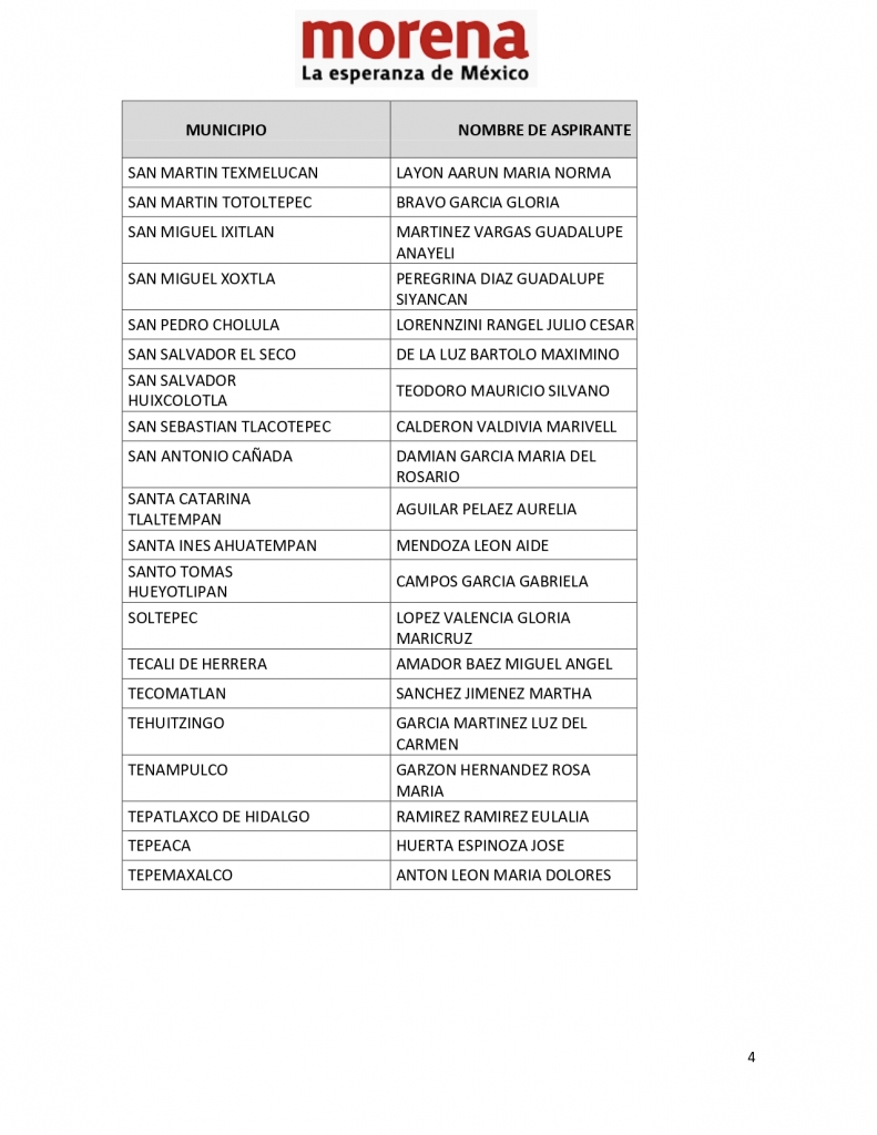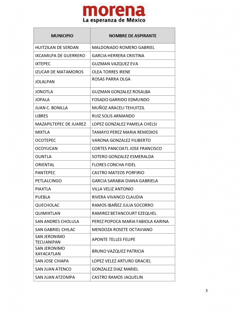Los perfiles seleccionados fueron notificados al Comité Ejecutivo Estatal de Morena en Puebla, encabezado por Edgar Garmendia de los Santos, secretario General con funciones de presidente del Comité Ejecutivo Estatal de Morena que, a nombre del presidente nacional del partido, Mario Delgado Carrillo, agradeció la participación de cientos de militantes y simpatizantes que, tras inscribirse como aspirantes a cargos de representación popular, participaron en este ejercicio democrático.