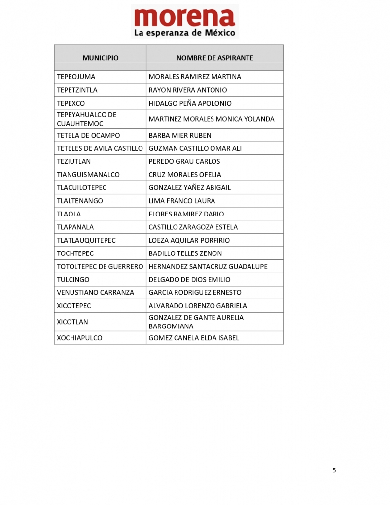 Puebla, Pue.- Este martes la Comisión Nacional de Elecciones de Morena definió su decisión sobre los candidatos que resultaron electos destinados para contender en los próximos comicios del 6 de junio para 116 presidencias municipales del estado de Puebla, enarbolando la bandera de Morena.