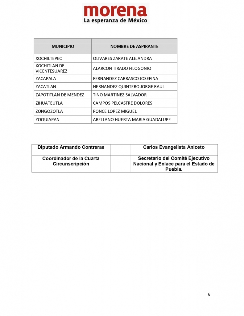 Las candidaturas seleccionadas por la Comisión Nacional de Elecciones fueron avaladas por Armando Contreras, coordinador de la Cuarta Circunscripción, además del secretario del Comité Ejecutivo Nacional (CEN) y enlace para Puebla, Carlos Evangelista Aniceto, e informadas a Edgar Garmendia de los Santos, a quien la comisión reconoce como dirigente.