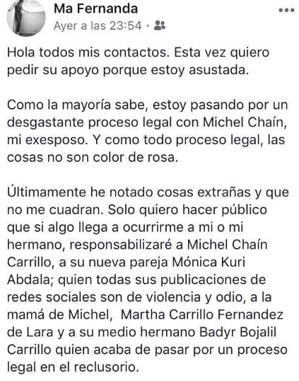 “Como la mayoría sabe, estoy pasando por un desgastante proceso legal con Michel Chaín, mi ex esposo. Y como todo proceso legal, las cosas no son color de rosa. Últimamente he notado cosas extrañas y que no me cuadran. Solo quiero hacer público que si algo llega a ocurrirme a mi o mi hermano, responsabilizaré a Michel Chaín Carrillo, y a su nueva pareja Mónica Kuri Abdala”, dice el texto.