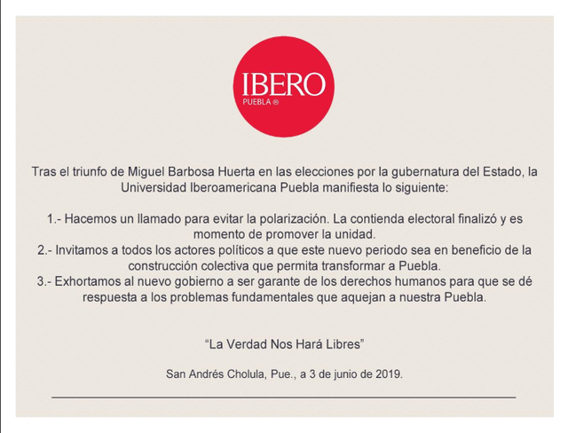 Puebla, Pue. La Universidad Iberoamericana campus Puebla, enlistó una serie de peticiones al virtual ganador de la elección extraordinaria, al gobierno del estado de Puebla, Luis Miguel Barbosa Huerta, de acuerdo con el contero rápido del Instituto Nacional Electoral (INE).