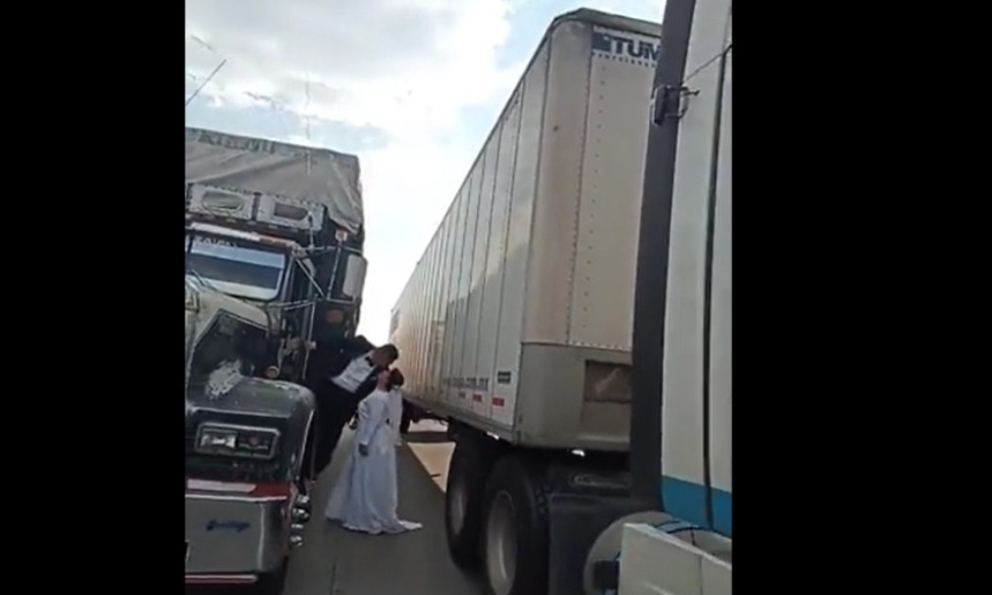 No obstante, en medio del bloqueo vehicular, una pareja de novios decidió encender los ánimos y motivó a sus invitados a convertir la angustiante espera en un festejo.