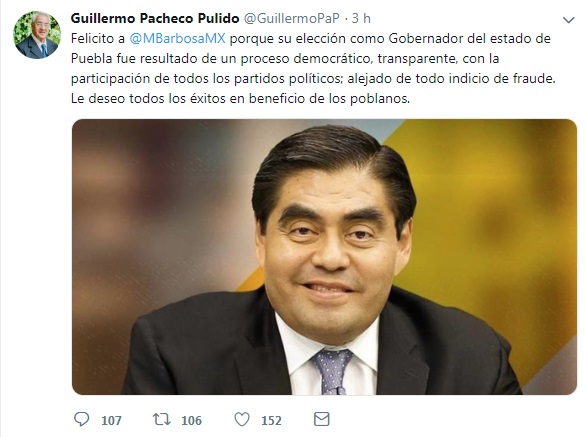 “Felicito a @MBarbosaMX porque su elección como Gobernador del estado de Puebla fue resultado de un proceso democrático, transparente, con la participación de todos los partidos políticos; alejado de todo indicio de fraude. Le deseo todos los éxitos en beneficio de los poblanos”, escribió.