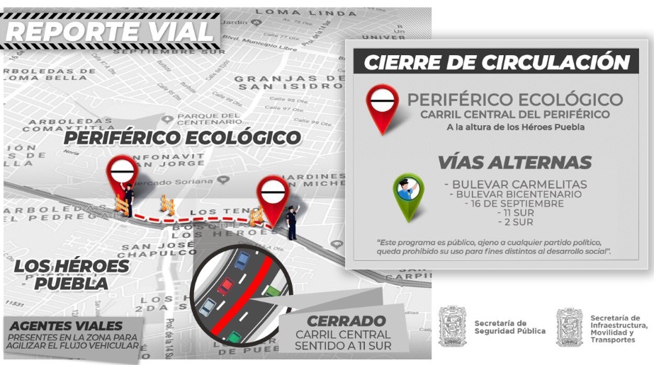 Para evitar contratiempos, la dependencia detalló que las vías alternas son: Boulevard Carmelitas, Boulevard Bicentenario, 16 de Septiembre, 11 Sur y 2 Sur.