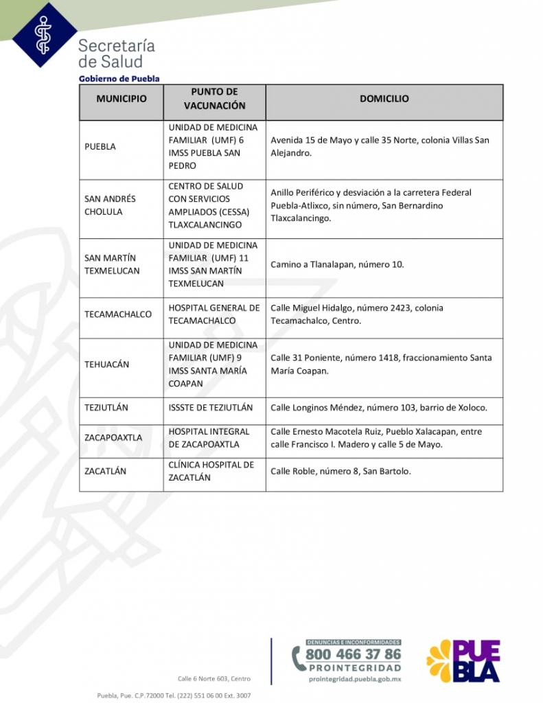 Los municipios en donde estarán ubicados los módulos son: Acatlán de Osorio, Amozoc de Mota, Atlixco, Chalchicomula de Sesma, Coxcatlán, Huauchinango, Huejotzingo, Izúcar de Matamoros, Libres, Puebla capital donde habrá dos, además de San Andrés Cholula, San Martín Texmelucan, Tecamachalco, Teziutlán, Tehuacán, Zacapoaxtla y Zacatlán.