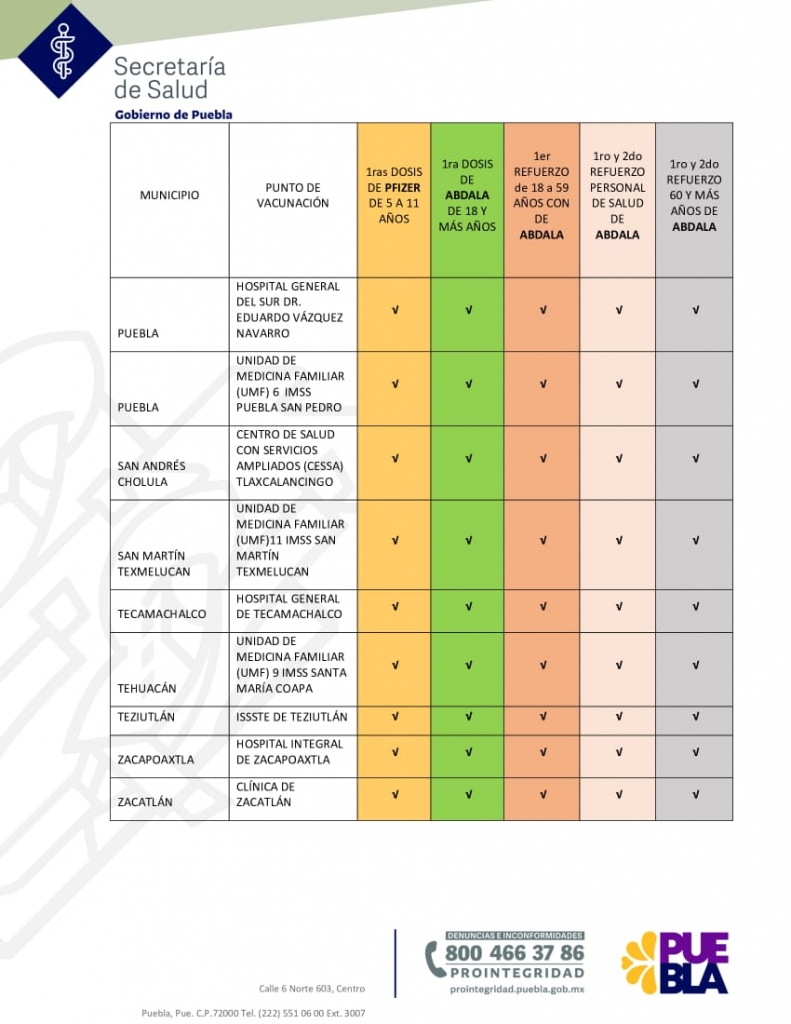 Puebla, Pue. – La Secretaría de Salud en el estado informó que a partir de este martes 27 de diciembre y hasta el 05 de enero, estarán habilitados 18 puntos permanentes de vacunación contra el SARS-CoV-2 en 10 jurisdicciones sanitarias, con horario de atención de 08:00 a 15:00 horas de lunes a viernes.